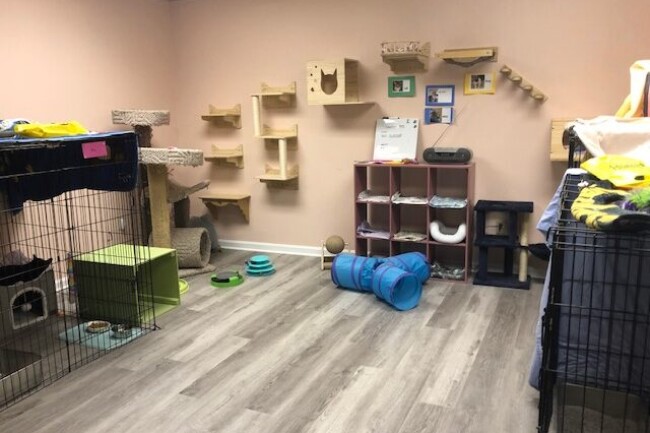 The free roaming room allows the resident cats to stay in their open cages or to explore the room and engage with other cats. There are many fun things to do and climbing opportunities throughout the room. They can interact freely with the volunteers and one another.